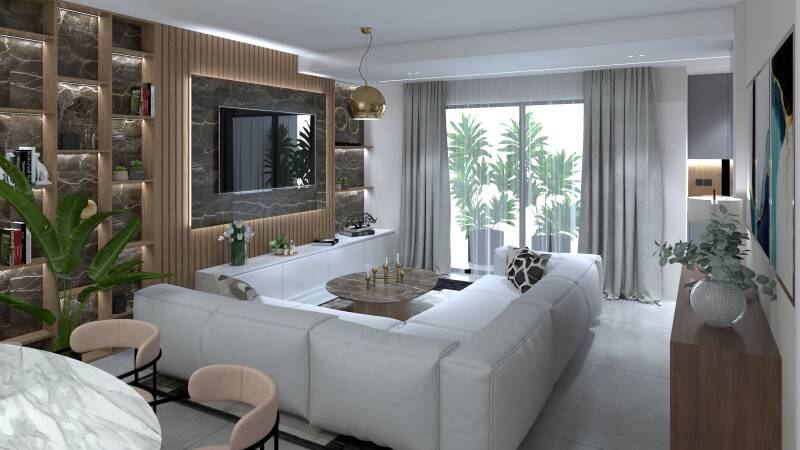 Οι πρώτοι 4 όροφοι αποτελούνται από διαμερίσματα των 78m2 και διαθέτουν καθιστικό, τραπεζαρία, κουζίνα, 2 υπνοδωμάτια, λουτρό και wc. Το τελευταίο διαμέρισμα διαχωρίζεται σε 2 στάθμες. Η πρώτη στάθμη αποτελείται από το σαλόνι, την τραπεζαρία, την κουζίνα, ένα wc και ένα υπνοδωμάτιο με ιδιωτικό λουτρό. Η δεύτερη στάθμη αποτελείται από 2 υπνοδωμάτια και ένα λουτρό. Το κάθε διαμέρισμα διαθέτει την δική του θέση στάθμευσης και την δική του αποθήκη.